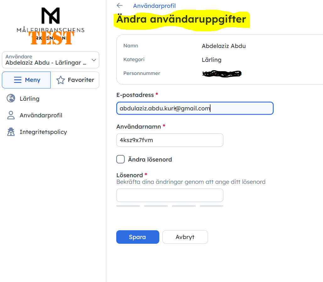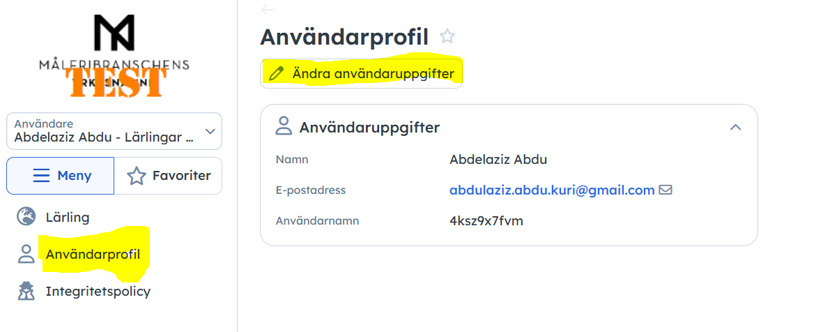Ändra din E-post och användarnamn under "Användarprofil" Logga in i Lärlingsportalen med BankID via MYNs hemsidaVälj "Användarprofil"Ändra användaruppgifter Fyll i dina ändringar och spara